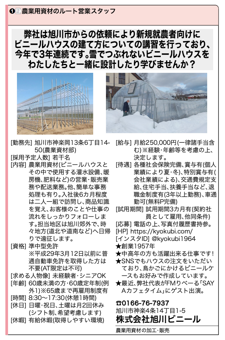 雪でつぶれないビニールハウスをわたしたちと一緒に設計しませんか? 担当地区は旭川郊外で営業担当者を若干名募集します。いつか「新旭ビの7人」として紹介できればと思っております。